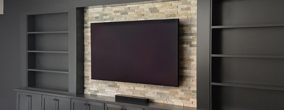 Every renovation — big or small — comes with its curveballs. Ours was no exception. What started as a big, elaborate vision ended up becoming something simple—and in many ways, that simplicity made it even better. We added built-ins for storage along the main wall, painted in Benjamin Moore Black Jack, and finished it with stone tile behind the TV that now continues down the hallway. Paired with BM Revere Pewter walls, added trim details, and a new pet performance carpet that feels surprisingly luxurious, it completely transformed the feel of the space.
